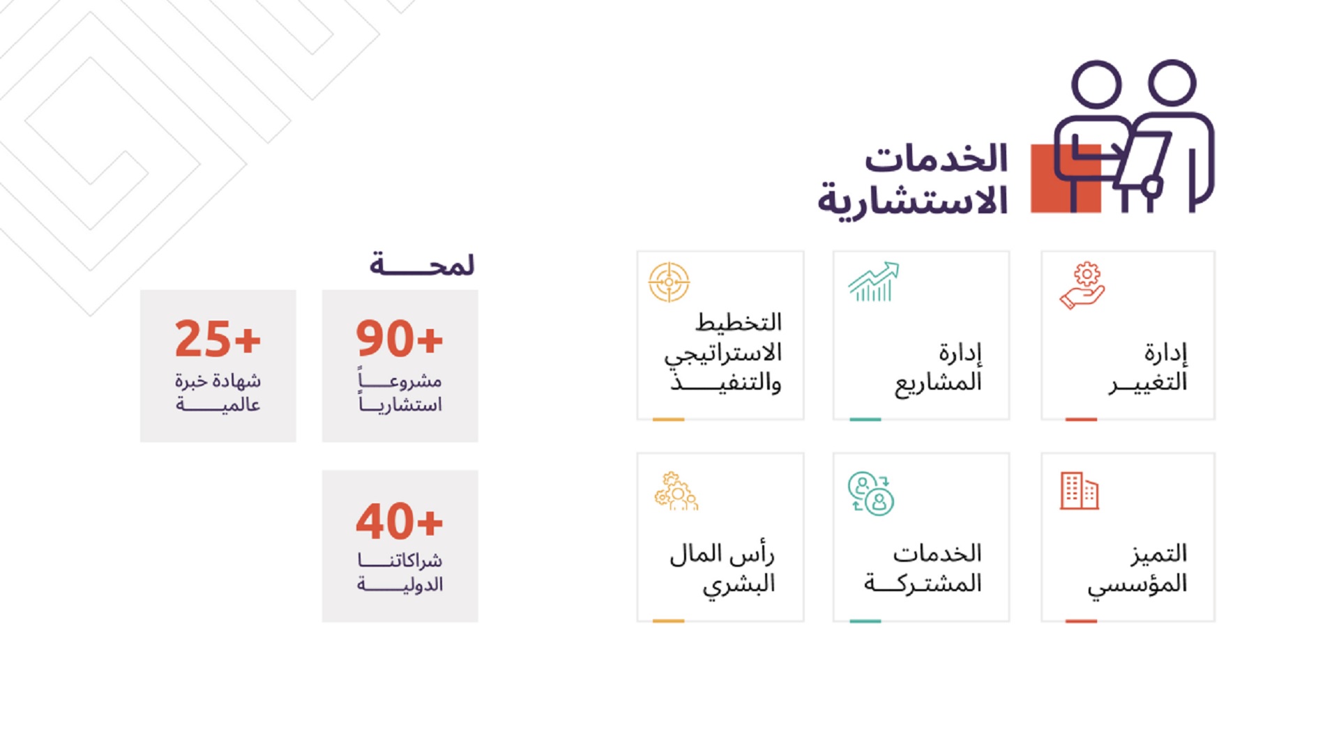شركة وطنية رائدة في تقديم الخدمات الاستشارية، وخدمات التحول الرقمي، وخدمات الموارد البشرية، وإدارة الفعاليات. نركّز على بناء المحتوى المحلي بما يسهم في تمكين المنظمات من تطوير حلول تتناسب مع احتياجاتها المتنامية وأهدافها الاستراتيجية المستدامة.